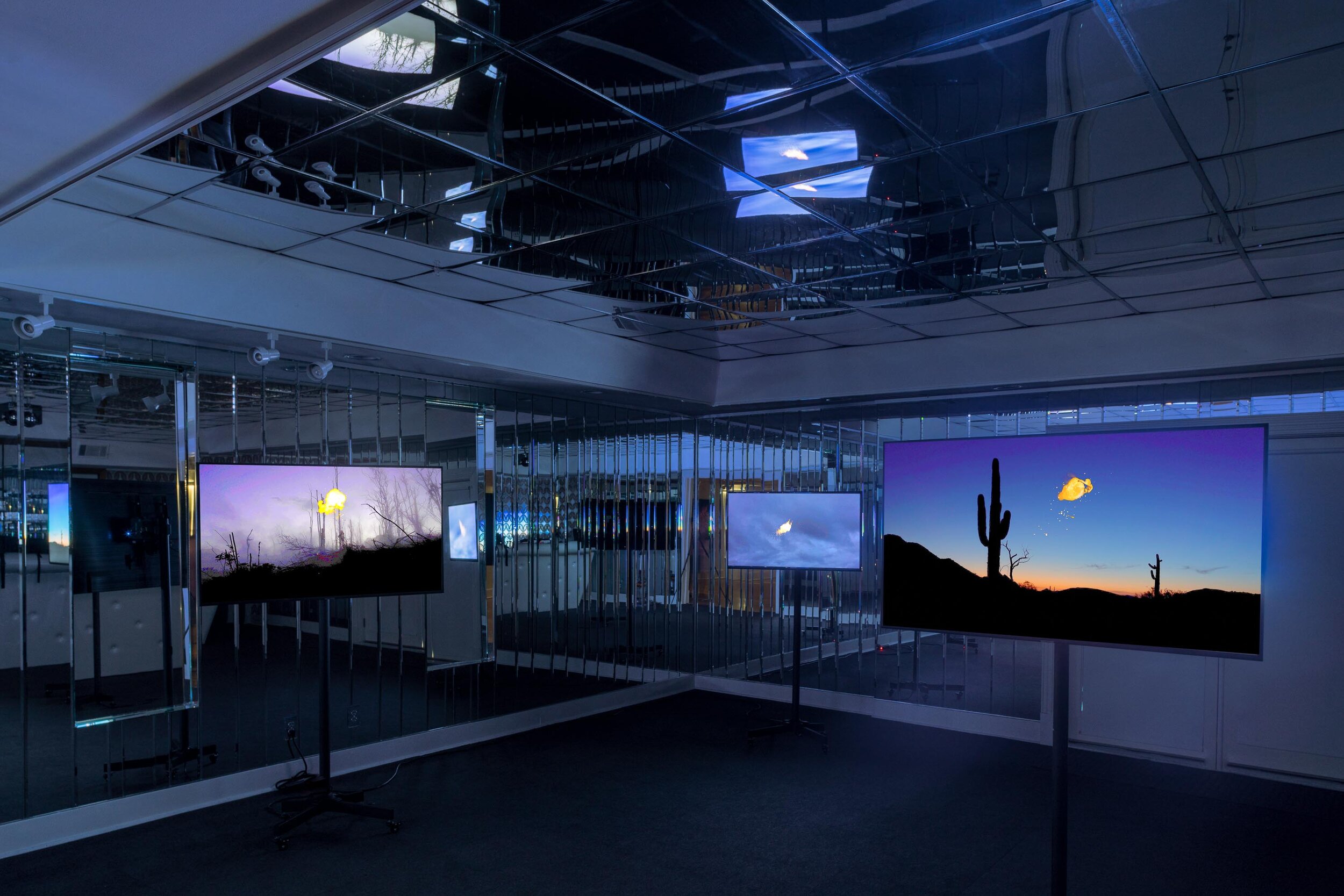 The exhibition includes three videos in the gallery’s upstairs, mirrored room. Using a high-speed Phantom video camera, Cooley transforms each momentary explosion into minutes-long spectacles which replicate endlessly across the mirrored walls. Time, light, space, materiality, and immateriality; all merge in mesmerizing color and abstraction. Each composition seems to slowly unfold in front of the eyes, collapsing stillness and motion in a singular frame, a compelling tension in Cooley’s work.