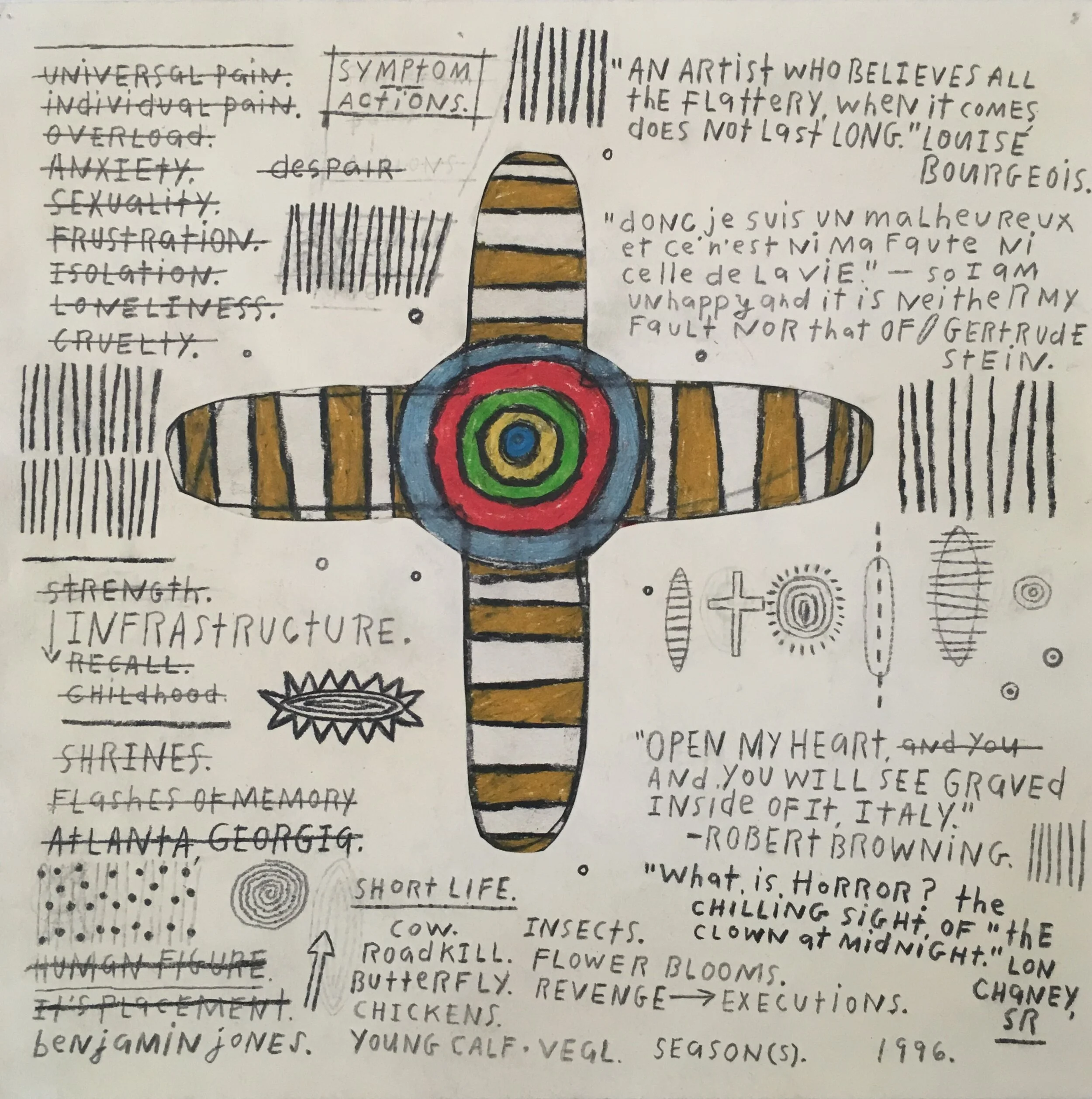 As a keen observer of current events, Jones keeps intricate journals, day and night, collecting images clipped from newspapers, or gathered from his travels that become source material for his drawings. But, in the end, Jones chooses an isolated life, carefully guarding his time and energy for art making.
